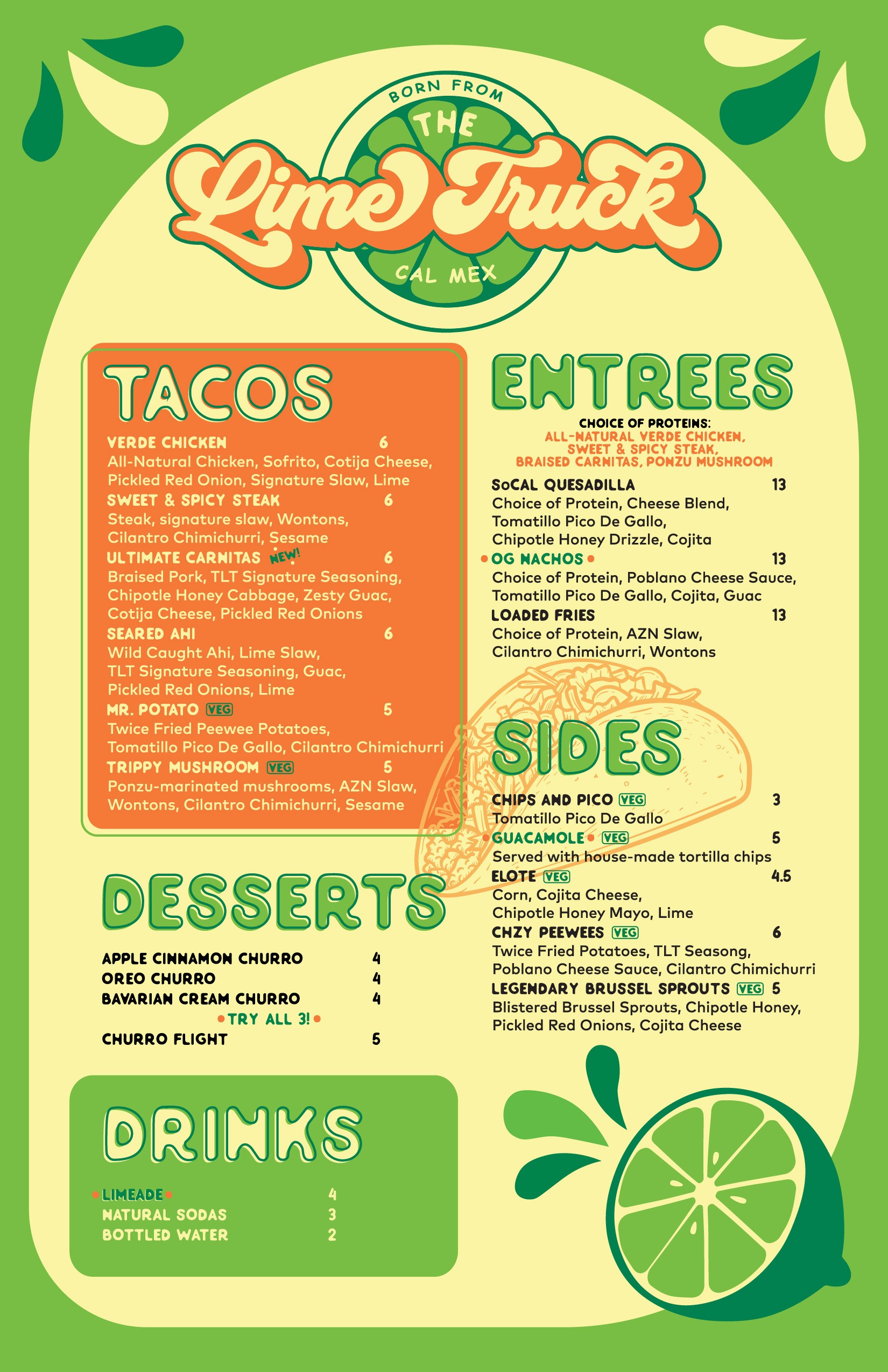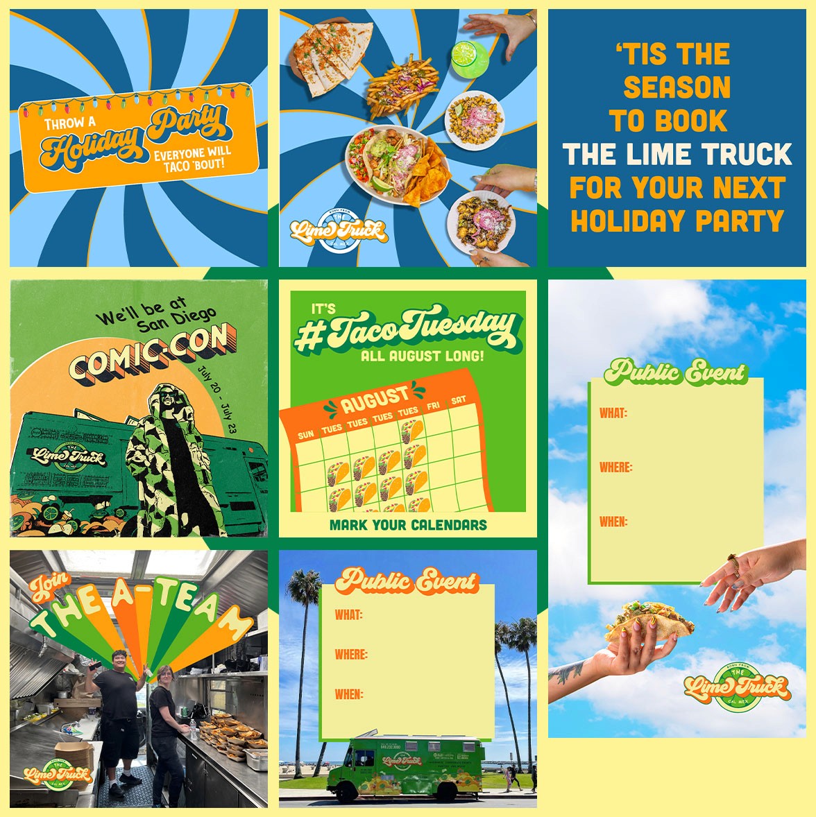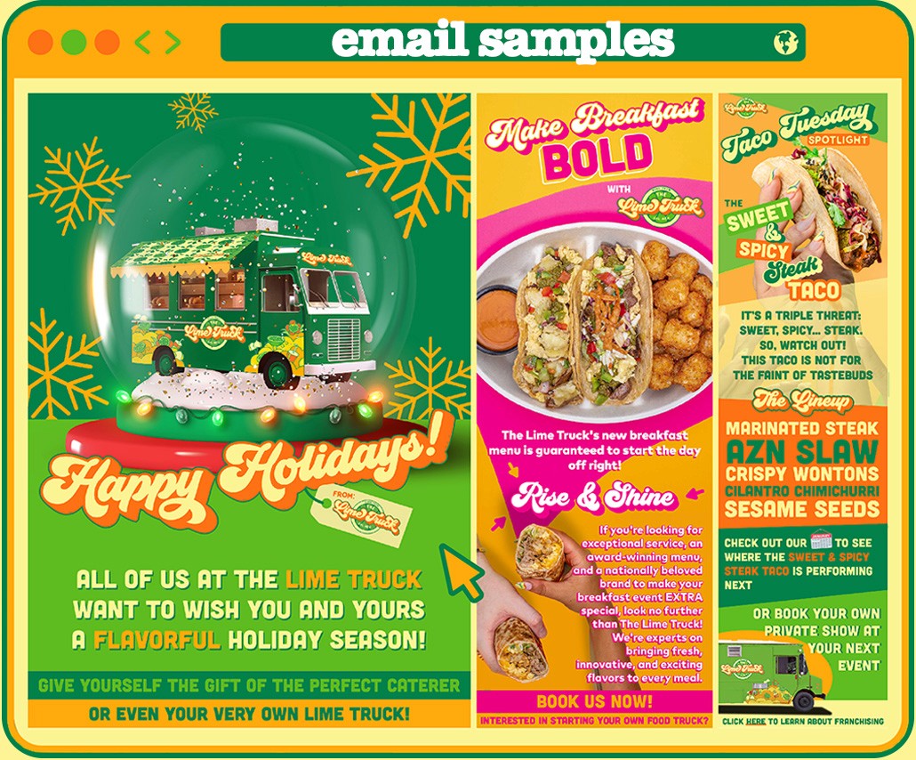 Menus, socials, brand guidelines, book covers, franchise presentations, you name - we've done it! I had such a fun time manifesting The Lime Truck brand across all these different channels.